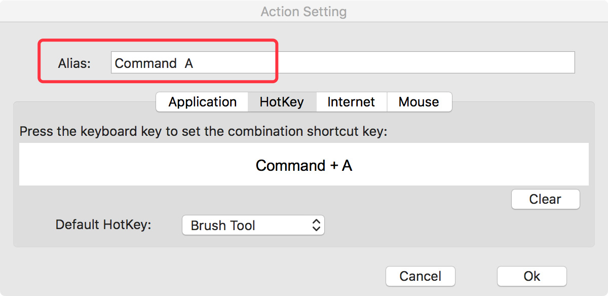 A janela de configuração é a mesma das teclas Expressas e da roda de rolagem. Tudo o que você precisa fazer é pressionar a tecla do teclado ou a combinação de teclas do comando desejado. Depois de vê-lo no retângulo branco, você pode pressionar Ok e sair.