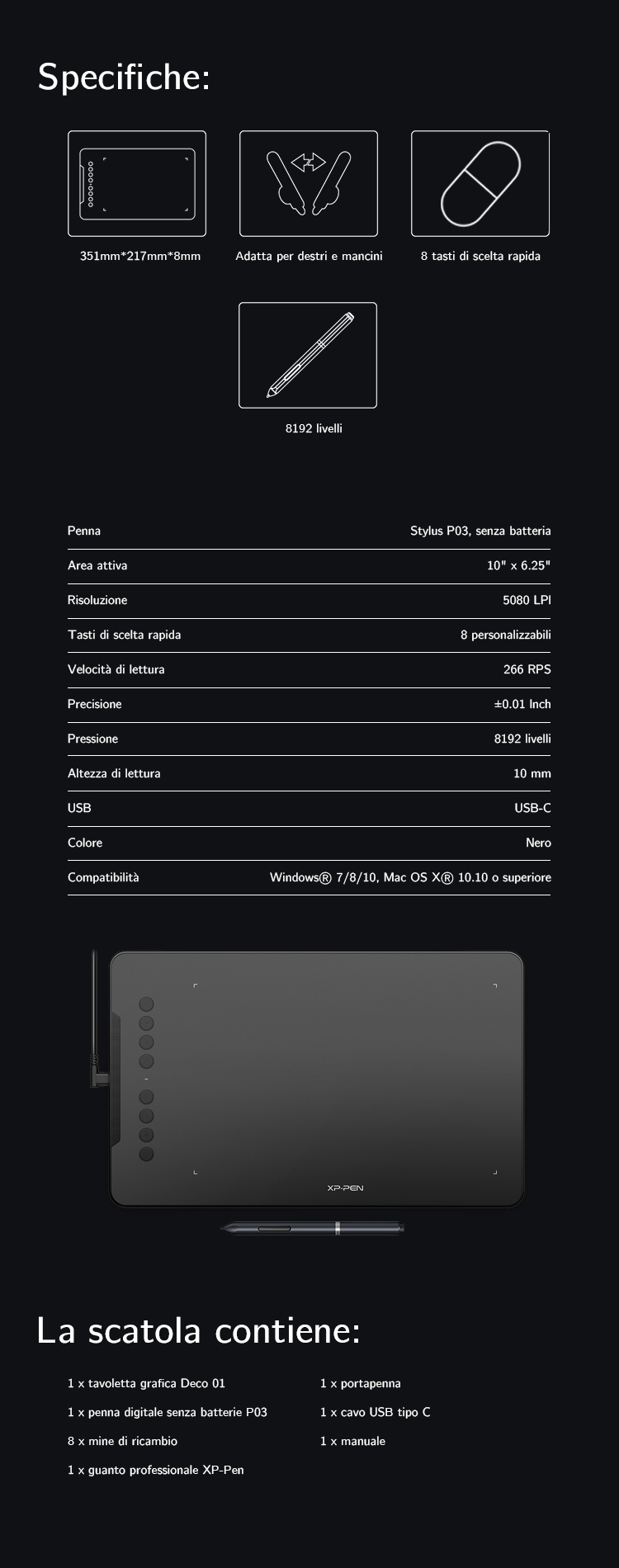 The Deco 01's expansive tablet is big and brilliant, yet still designed to break through the limit between express keys and drawing area. The special squares design on the back and side states a retro fashion.